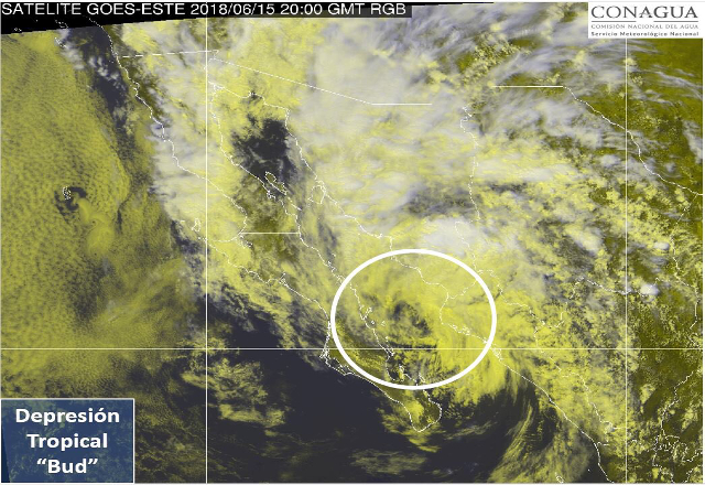 15/06/18.- El Servicio Meteorológico Nacional (SMN) informó que la depresión tropical Bud se degradó a baja presión remanente sobre el Mar de Cortés.