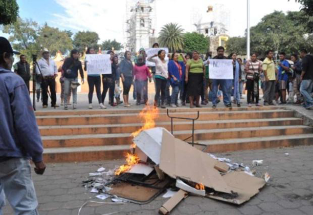 Decenas de hombres y mujeres en camionetas de redilas se trasladan de un poblado a otro para retirar las casillas y quemarlas, esto para exigir que se esclarezca el asesinato de Samir Flores Soberanes.