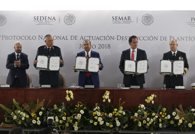 11/06/18.- El gabinete de seguridad del gobierno federal firmó el Protocolo Nacional de Actuación-Destrucción de Plantíos Ilícitos para consolidar de manera efectiva la coordinación para la localización y erradicación de cultivos de amapola y mariguana en el país.