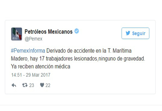Lo anterior fue confirmado por Pemex a través de su cuenta de Twitter, donde se indicó que durante el incidente se registraron 17 lesionados, ninguno de gravedad, quienes fueron atendidos por los servicios médicos y transportados al Hospital Regional de Ciudad Madero.