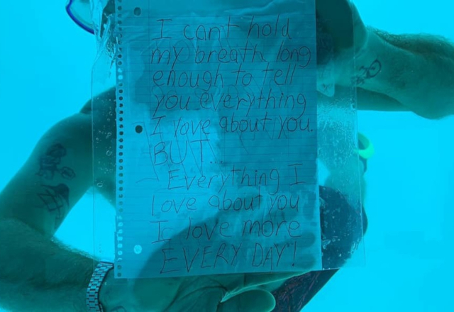 La joven compartió el video de Steven sumergido en un estanque de agua sin equipo adecuado para bucear. La imagen muestra al hombre nadando detrás de un cristal y le muestra una hoja de papel a Kenecha que dice: "No puedo aguantar la respiración lo suficiente para decirte todo lo que amo de ti".