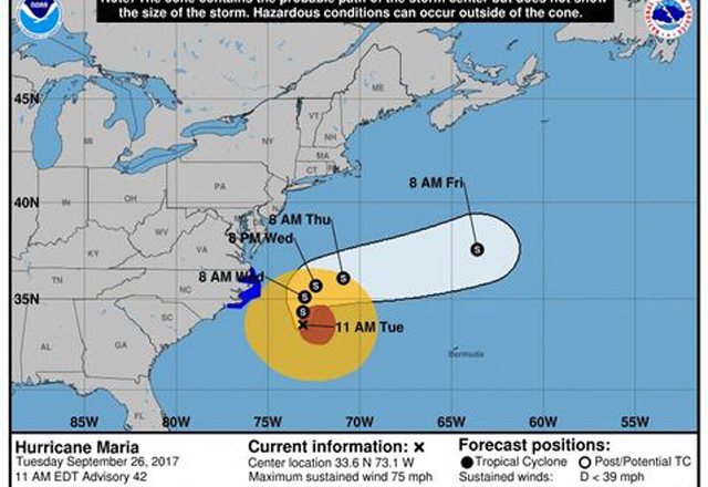 En su boletín de las 20.00 hora local (00.00 GMT), los expertos del NHC indican que María está a 155 millas (245 km) al este sureste de Cabo Hatteras, en Carolina del Norte, prosigue su acercamiento a la costa de Estados Unidos.