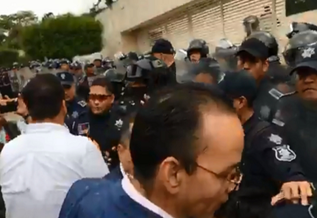 Granaderos apostados en la entrada del inmueble, cuyas cortinas metálicas fueron bajadas, impidieron el intento de acceso en que hubo forcejeos.