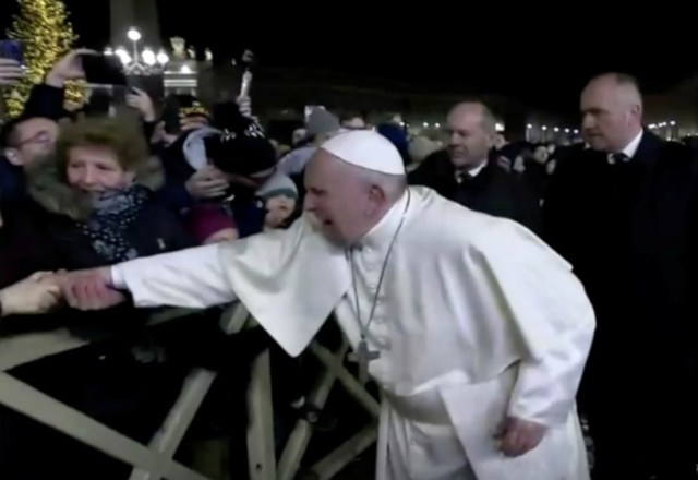 El incidente se produjo el martes por la noche en una caminata en la Plaza de San Pedro. La peregrina, que no ha sido identificada, inesperadamente agarró la mano del Papa, de 83 años, tirando de él hacia ella. Francisco, claramente disgustado, se liberó dándole un manotazo en el brazo.
