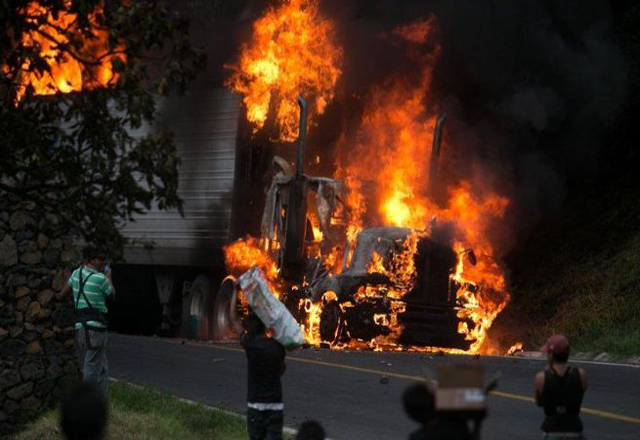 Durante el operativo desplegado por la SSP a través del Grupo de Operaciones Especiales (GOE) los estudiantes se enfrentaron a los uniformados en dicha vía de comunicación en la desviación a Purépero, en donde quemaron al menos una unidad de autotransporte.