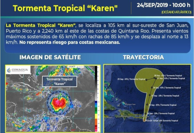 Karen se mueve hacia el norte a 75 kilómetros por hora y se encuentra a 35 millas (55 km) al sureste de San Juan (Puerto Rico) y a unas 70 millas (110 km) al oeste noroeste de la isla de St. Croix, según el boletín emitido a las 17:00 horas locales.