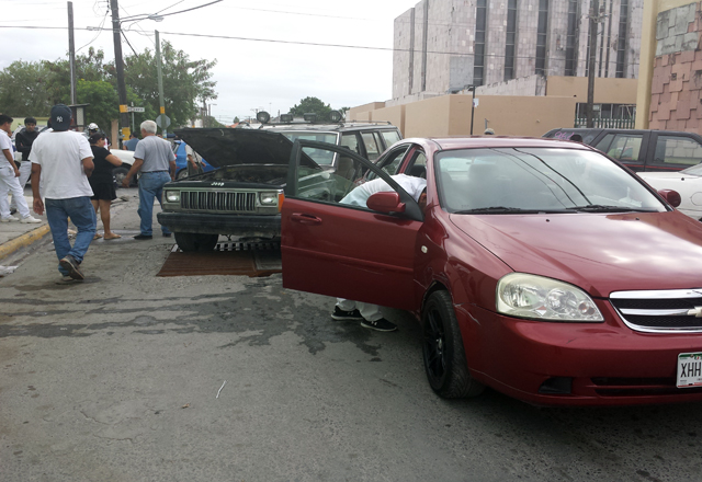 Erick Alejandro Salgado, de 22 años de edad, radicado en la calle Felipe Rocha No. 58 del fraccionamiento Paseo del Magisterio, es el conductor del Chevrolet Optra modelo 2009 de color guinda, quien explica que estaba haciendo alto cuando la camioneta que estaba parada repentinamente se arranca de reversa, causándole daños en un costado además de que también le pega a una Liberty negra que es propiedad de Georgina Salazar Rodríguez, de 38 años de edad, que iba circulando por la calle Quinta al momento del percance.