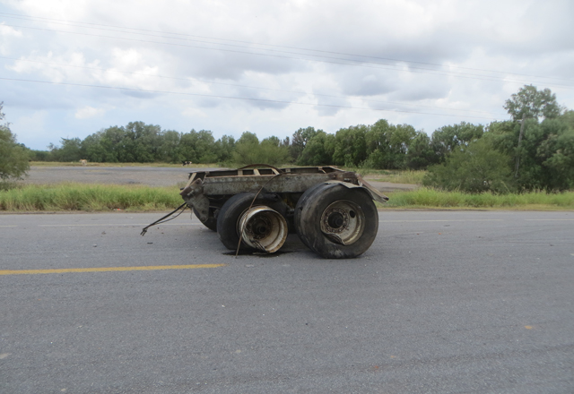 27/09/2016 - Grave resultó una joven mujer de la colonia Ampliación 20 de Noviembre, en el kilómetro 30 de la carretera a Reynosa, al impactar la camioneta que conducía, con la parte posterior de la caja del tráiler, que iba a la República de El Salvador, la cual se fue en rastra varios metros, al desprendérsele el carrito, con las ocho llantas de los dos ejes.