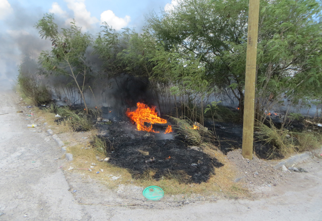 25/07/2016 - Dos zacatales con basura y llantas de vehículos, se ardieron el día de ayer, en el fraccionamiento Infonavit Jardines de San Felipe, originando que el fuego alcanzara dos viviendas, una de ellas habitada.