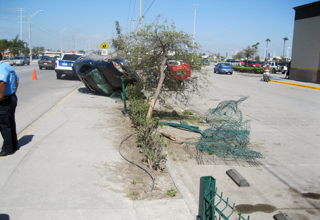 14/03/2016 - Un cafre del volante que chocó el carro que conducía contra una tela ciclónica y un árbol propiedad de Plaza Sendero, y dio varias volteretas, salió corriendo con una menor que lo acompañaba.