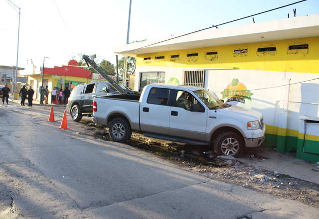 Los patrulleros de la Policía Vial solicitaron una grúa para remolcar la camioneta Nissan Armada al corralón de las avenidas Marte R. Gómez, entre Jorge Negrete y Pedro Cárdenas Gutiérrez.