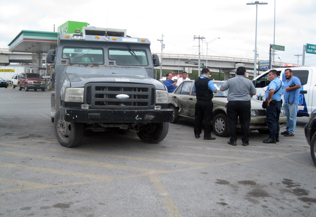 16/04/2016 - Un camión blindado, del Servicio Panamericano de Protección, S.A. de C.V., chocó en las avenidas Acción Cívica y División del Norte, contra el automóvil de una maestra.