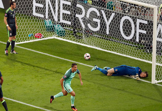 Lyon,6/07/16.- Un fulminante cabezazo de Cristiano Ronaldo al comienzo del segundo tiempo encaminó el miércoles a Portugal a la victoria 2-0 sobre Gales para avanzar a la final de la Eurocopa. En el