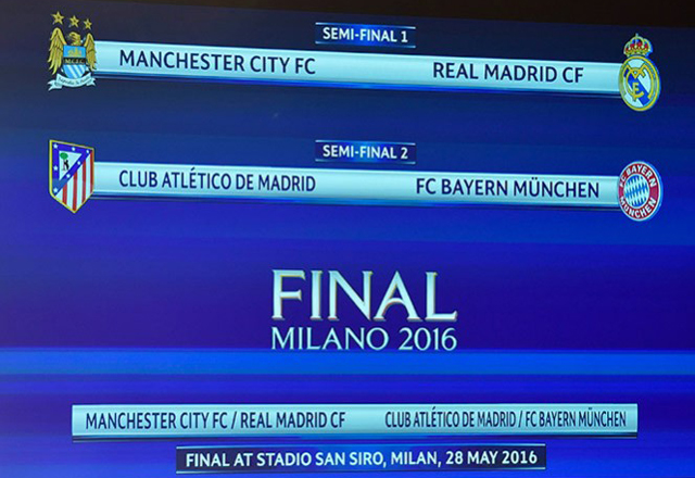 15/04/2016 - El Manchester City se enfrentará al Real Madrid y el Atlético de Madrid se batirá con el Bayern Múnich por un boleto para la final de la Liga de Campeones, que podría deparar una fi