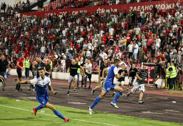 3/08/15.- Decenas de hinchas del equipo de futbol búlgaro CSKA Sofia interrumpieron el domingo por la noche un partido amistoso al salir al césped para pegar a los jugadores del conjunto rival, el M