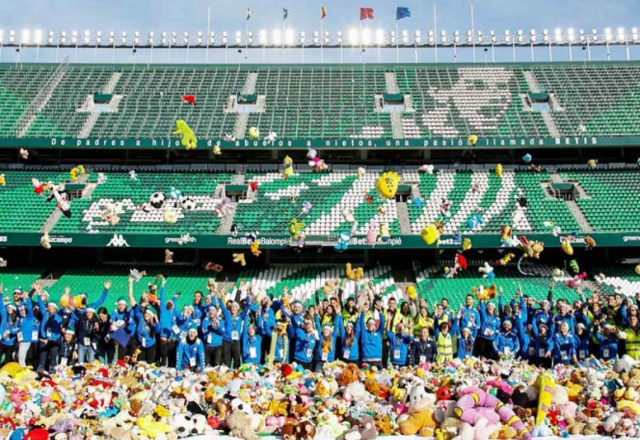 22/12/18.- El Estadio Benito Villamarín se tapizó de peluches. Al medio tiempo del encuentro entre el Betis y el Eibar, los aficionados se unieron a una noble causa y lanzaron muñecos a la cancha