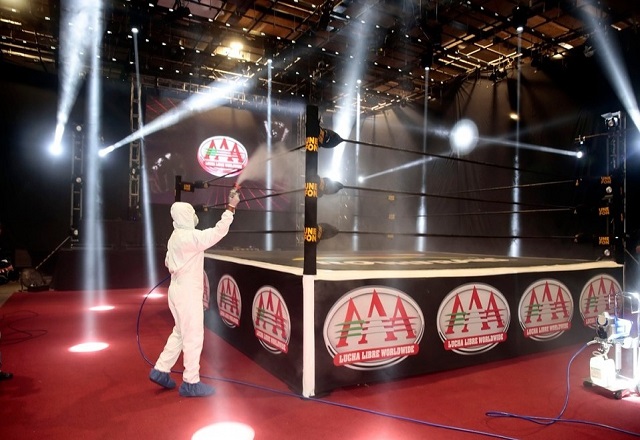 Antes del arranque de la segunda jornada del torneo Fighter AAA Live, el personal de salubridad volvió a implementar las medidas de limpieza que garanticen la seguridad de luchadores y personal de la