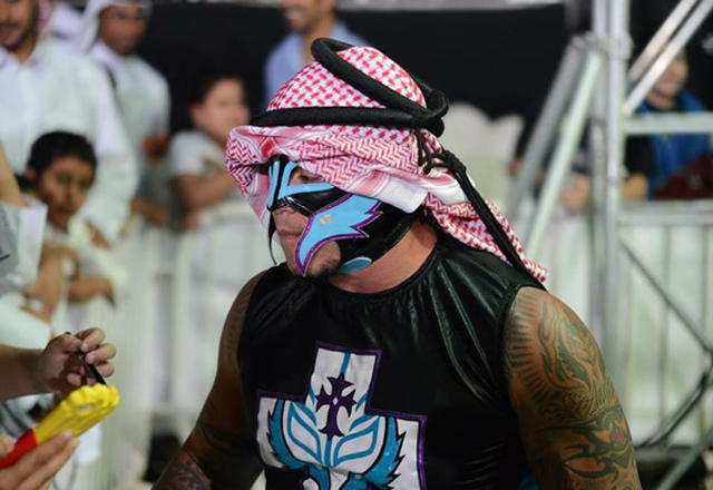 16/04/15.-Los luchadores mexicanos, Rey Mysterio y el Patrón Alberto, estelarizaron una función llena de ex luchadores de WWE y gladiadores independientes en Qatar. Los dos integrantes de AAA partic