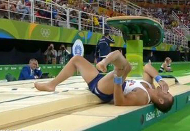 6/08/16.-El gimnasta francés Samir Ait Said se ha partido una pierna al caerse en la recepción de un salto durante la ronda de clasificación de los Juegos de Río. Tras doblarse y caer al suelo, Ai