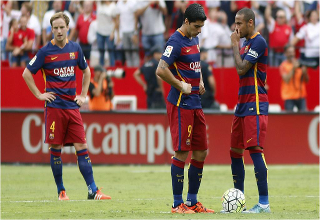 3/10/15 .- Los blaugranas, que no cuentan con el argetino Messi, pierden terreno en la clasificación general tras caer 2-1 en el estadio Sánchez Pizjuán El Barcelona vio la derrota 2-1 en su visit