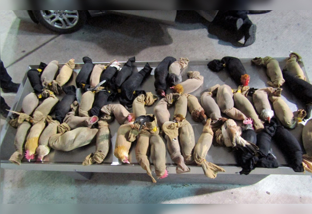Decomisan 47 gallos de pelea y gallinas en el puente 1 “Puerta de las Américas”, Nuevo Laredo. Viajaban escondidas dentro de un vehículo conducido por un norteamericano. El decomiso ocurrió el