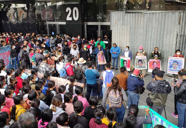Familiares de los 43 estudiantes de la Escuela Normal "Raúl Isidro Burgos" de Ayotzinapa desaparecidos desde 2014, protestan afuera de la Fiscalía General de la República (FGR) en demanda de la pre