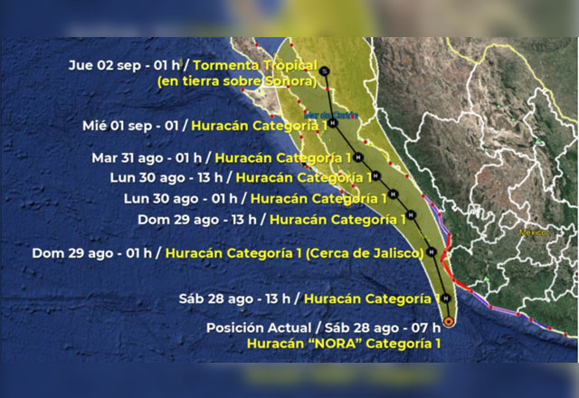 La tormenta tropical Nora se intensificó a huracán categoría 1 y se localizó frente a las costas de Jalisco y Colima. Se prevé que su trayectoria sea cercana a la costa del país durante el día,