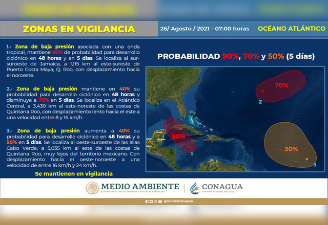 La zona de baja presión que se mueve en aguas del Caribe hacia las costas mexicanas, alcanzó un potencial de desarrollo ciclónico del 90%, de acuerdo con reportes del Servicio Meteorológico Nacion
