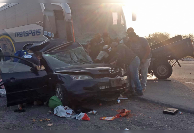 Ciudad Victoria, Tamaulipas.- Una mujer sin vida y al menos nueve personas heridas fue el saldo de un choque frontal en el que estuvieron involucrados dos vehículos y un autobús de la linea Transpai