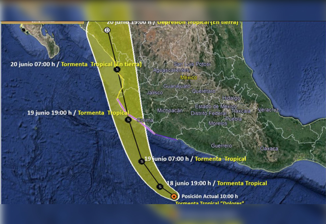 A las 10:00 horas de este viernes, tiempo del Centro de México, se formó la tormenta tropical Dolores, a partir de la Depresión Tropical 4-E, en el Océano Pacífico y el Sistema Meteorológico Nac