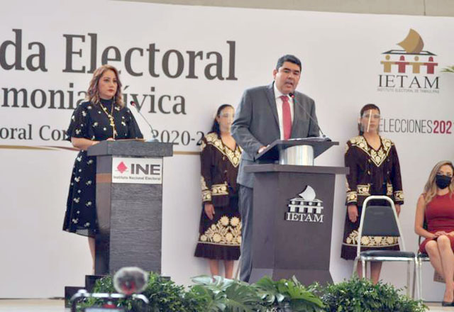 Ciudad Victoria, Tam.- Con una ceremonia cívica encabezada por los presidentes de los Consejos Generales del INE y del IETAM, Olga Alicia Castro Ramírez y Juan José Ramos Charre arrancó el proceso