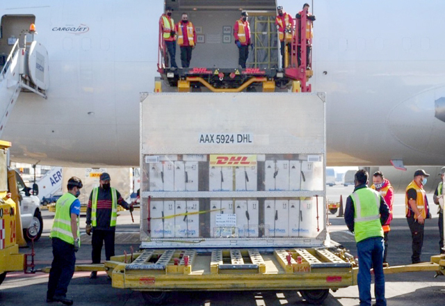Un lote con 170 mil 625 dosis de la vacuna contra el coronavirus, desarrollada por Pfizer/ BioNTech, llegó al Aeropuerto Internacional de la Ciudad de México (AICM), como complemento del cargamento