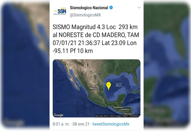 El Servicio Sismologico Nacional (SSN) reportó durante la mañana de este viernes 08 de enero un sismo frente a las costas de Ciudad Madero en el Golfo de México. El fenómeno natural tuvo una magni