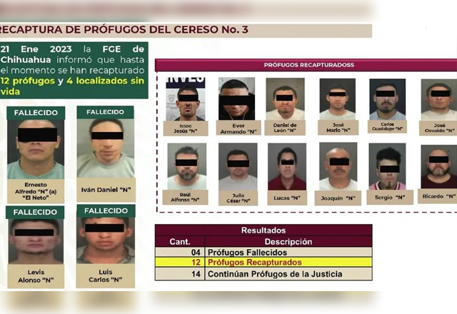 Siguen prófugos 14 de los 30 reos que escaparon del Centro de Readaptación Social (Cereso) 3 de Ciudad Juárez, Chihuahua, informó Luis Rodríguez Bucio, subsecretario de Seguridad Pública. Sobre
