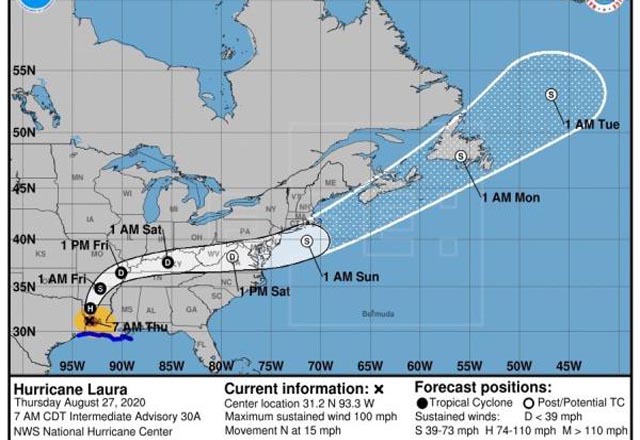 Laura fue degradada a tormenta tropical luego que la madrugada de hoy tocó tierra como huracán categoría 2 en las costas de Luisina, en Estados Unidos, provocando vientos máximos sostenidos de has