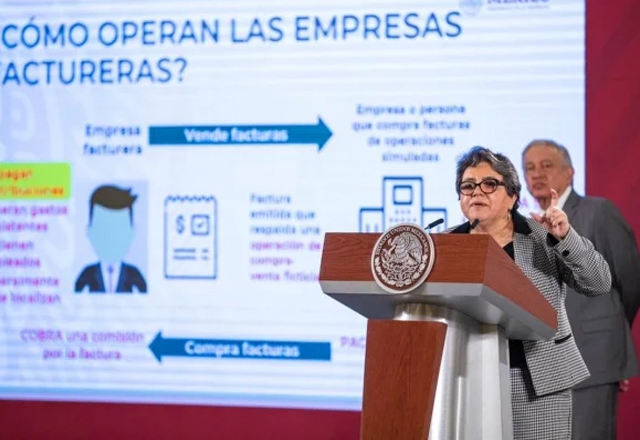 Raquel Buenrostro, jefa del Servicio de Administración Tributaria (SAT), presentó el primer paquete de denuncias en contra de 43 empresas factureras que, al emitir facturas falsas en operaciones sim