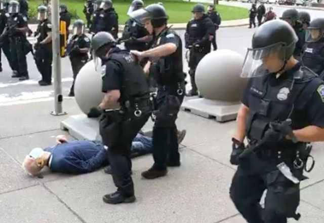Dos policías fueron suspendidos este jueves sin goce de sueldo en Buffalo, Nueva York, después de que se diera a conocer un video donde se les ve empujar a un adulto mayor que cae al suelo y se golp