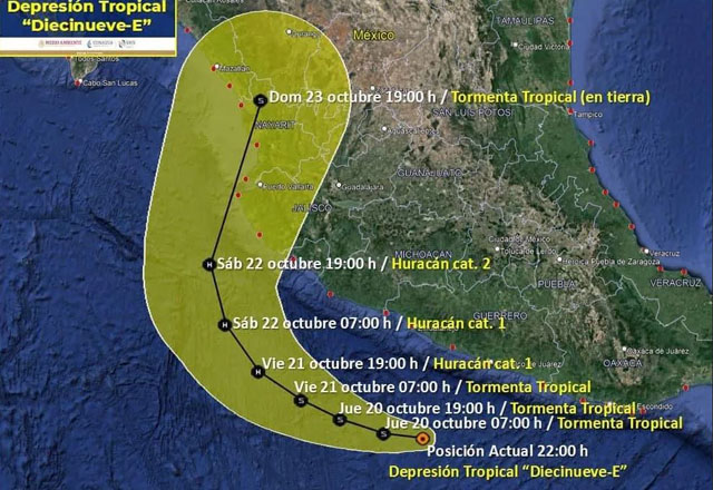 El Servicio Meteorológico Nacional prevé que la depresión tropical "Diecinueve-E" evolucione a tormenta tropical hoy, jueves 20 de octubre 2022, en el oceano Pacífico, en las costas de México. De