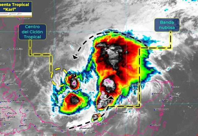 El Servicio Meteorológico Nacional (SMN) informó que la tormenta tropical Karl se mueve lentamente frente a las costas de Veracruz. Sus bandas nubosas provocarían lluvias fuertes a intensas en el O