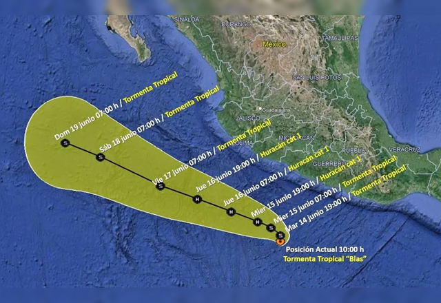 El Servició Meteorológico Nacional (SMN) informó que un sistema de baja presión se desarrolló como tormenta tropical con el nombre de Blas, frente a las costas de Guerrero. "La depresión tropica