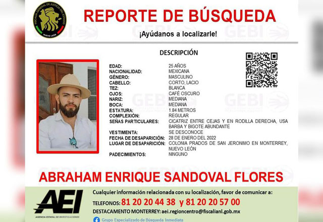 La Agencia Estatal de Investigaciones (AEI) emitió un reporte de búsqueda para localizar a un joven de 25 años, quien aparentemente desapareció en Nuevo Laredo, Tamaulipas. Abraham Enrique Sandova