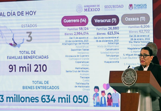 La secretaria de Seguridad, Rosa Icela Rodríguez, informó que a través de los Tianguis del Bienestar se han regalado en 32 municipios de Oaxaca, Veracruz y Guerrero, 3 millones 634 mil 50 artículo