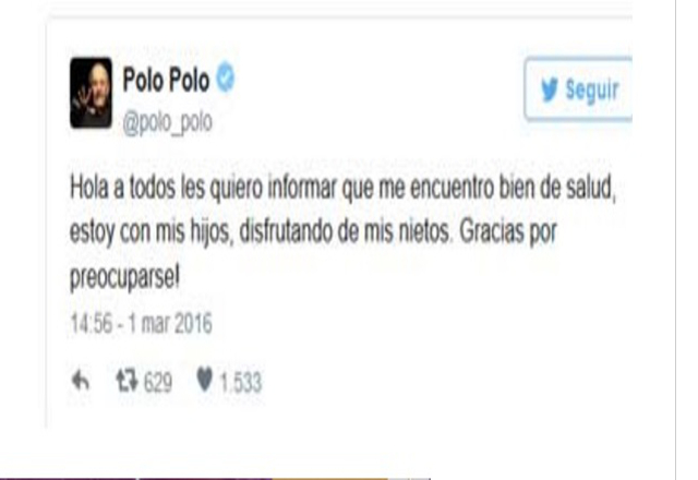 1/03/16.-El comediante Polo Polo confirmó mediante su cuenta oficial de Twitter que se encuentra bien y está junto a sus hijos y nietos, esto luego de que surgiera la noticia de que se encontraba de