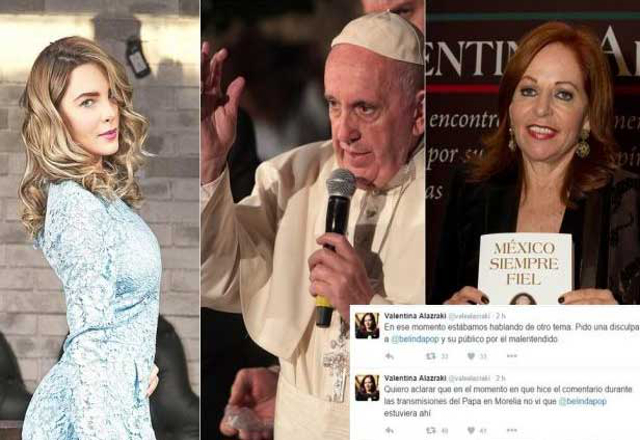 Ciudad de México,18/02/16.- La periodista Valentina Alazraki aclaró en Twitter el comentario que hizo en una transmisión en el que implicó a la cantante Belinda con una molestia del Papa Francisco
