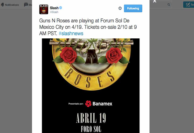 Ciudad de México,02/02/16.- La esperada reunión del grupo Guns N' Roses también podrá ser vista en México, pues se anunció un concierto de la banda. El show se realizará el próximo 19 de abril