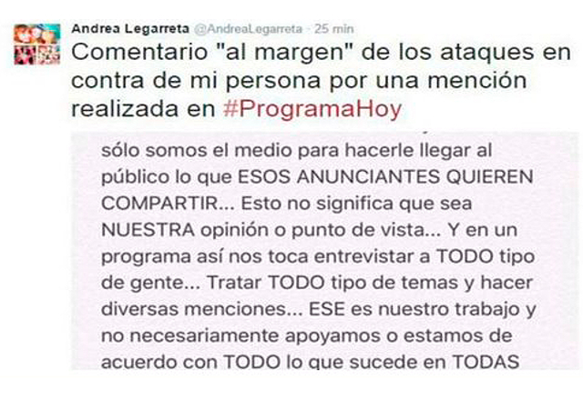 Ante la polémica que enfrenta por su comentario sobre el aumento del precio del dólar, la conductora Andrea Legarreta publicó en Twitter un mensaje para aclarar la situación y dar a entender que s