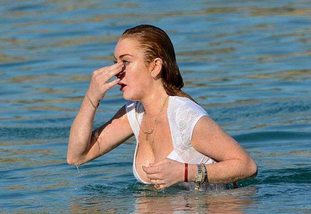 21/07/15.- La actriz estadounidense Lindsay Lohan sorprendió en playas de Grecia, en donde fue captada el lunes. Sin importar que no llevara traje de baño listo, la joven decidió meterse al agua co