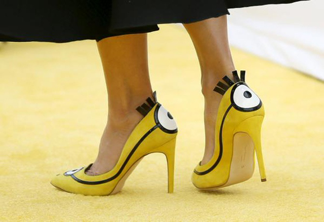 2/07/15.-Los zapatos que usó Sandra Bullock en la premier de la película Minions, fueron diseñados por Rupert Sanderson y tienen un costo aproximado a 800 dólares. Los originales zapatos de Sandra