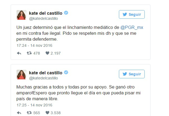 15/11/16.-A través de su cuenta de Twitter, la actriz Kate del Castillo dio a conocer que ganó otro amparo, así como su deseo de poder volver a su país de manera libre. “La Reina del Sur” señ