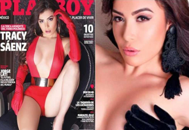 26/04/16.-Tracy Sáenz, la modelo del polémico video de Gerardo Ortiz, es la figura en el número de mayo de la revista “Playboy” México. En la portada de la publicación Tracy aparece con un bo
